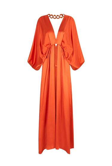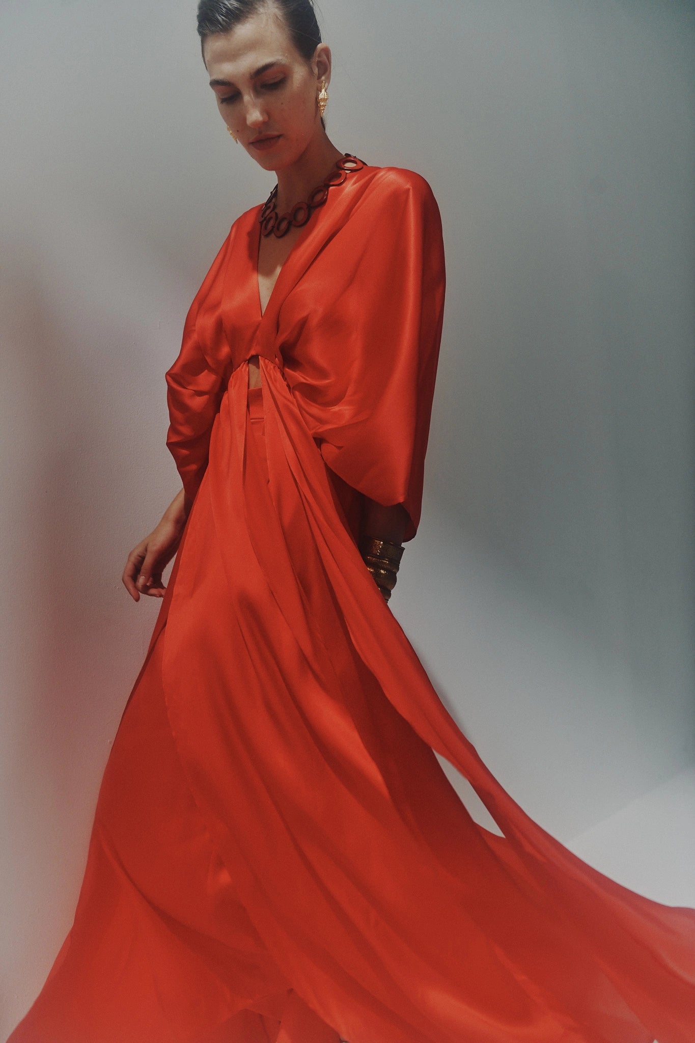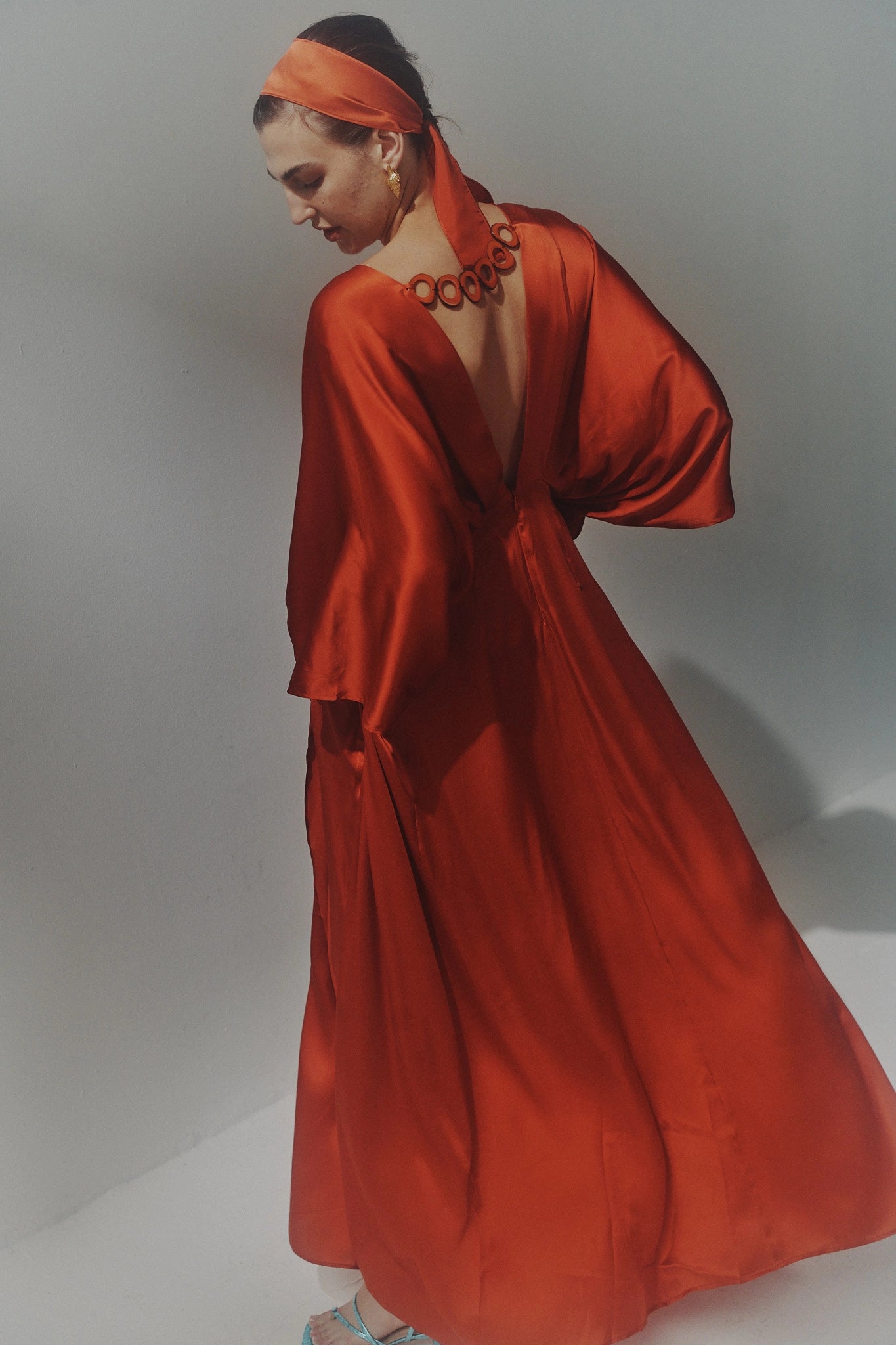 Long maxi dress in silk satin with open loose-flowing shape cut