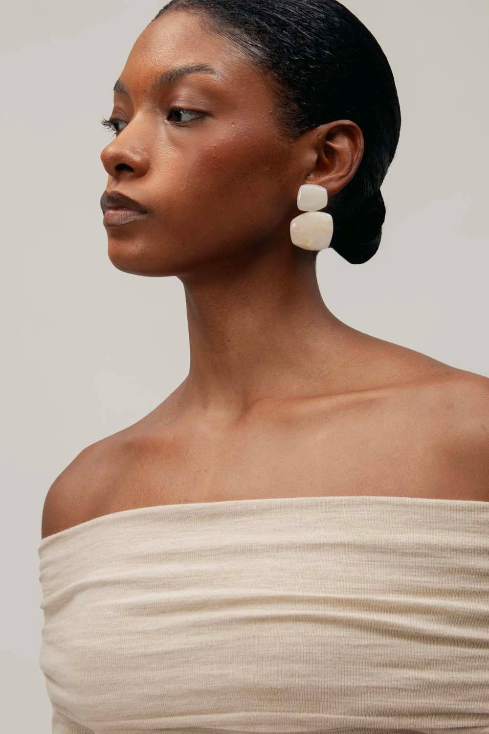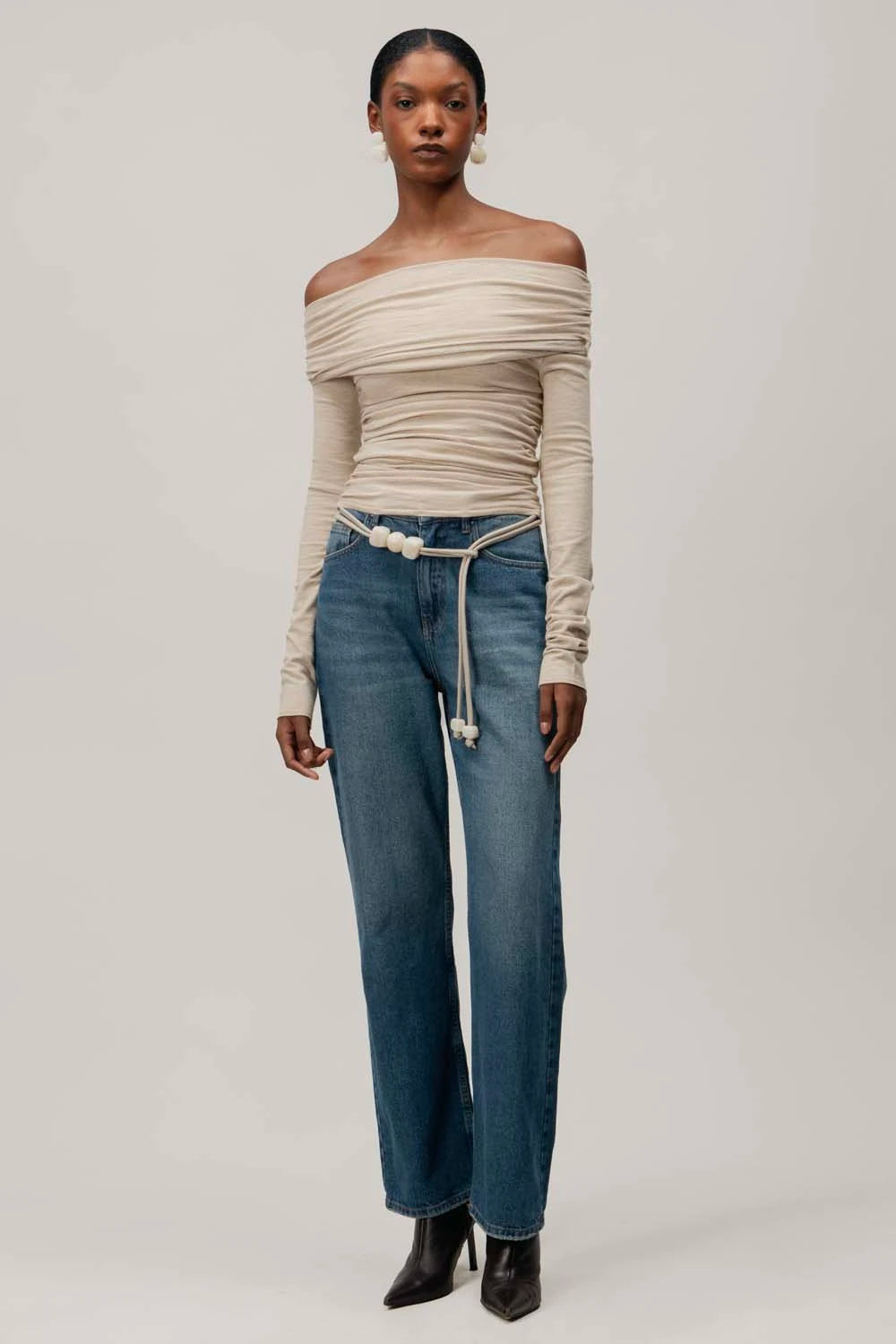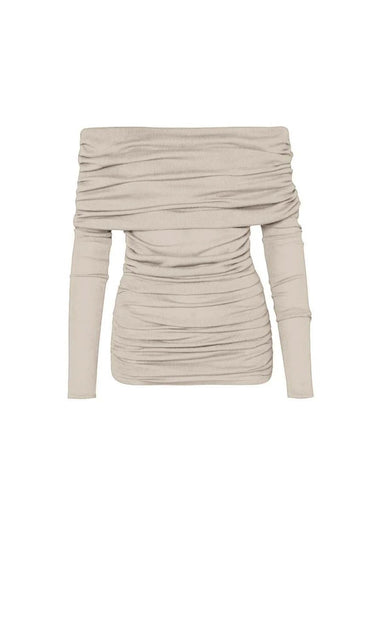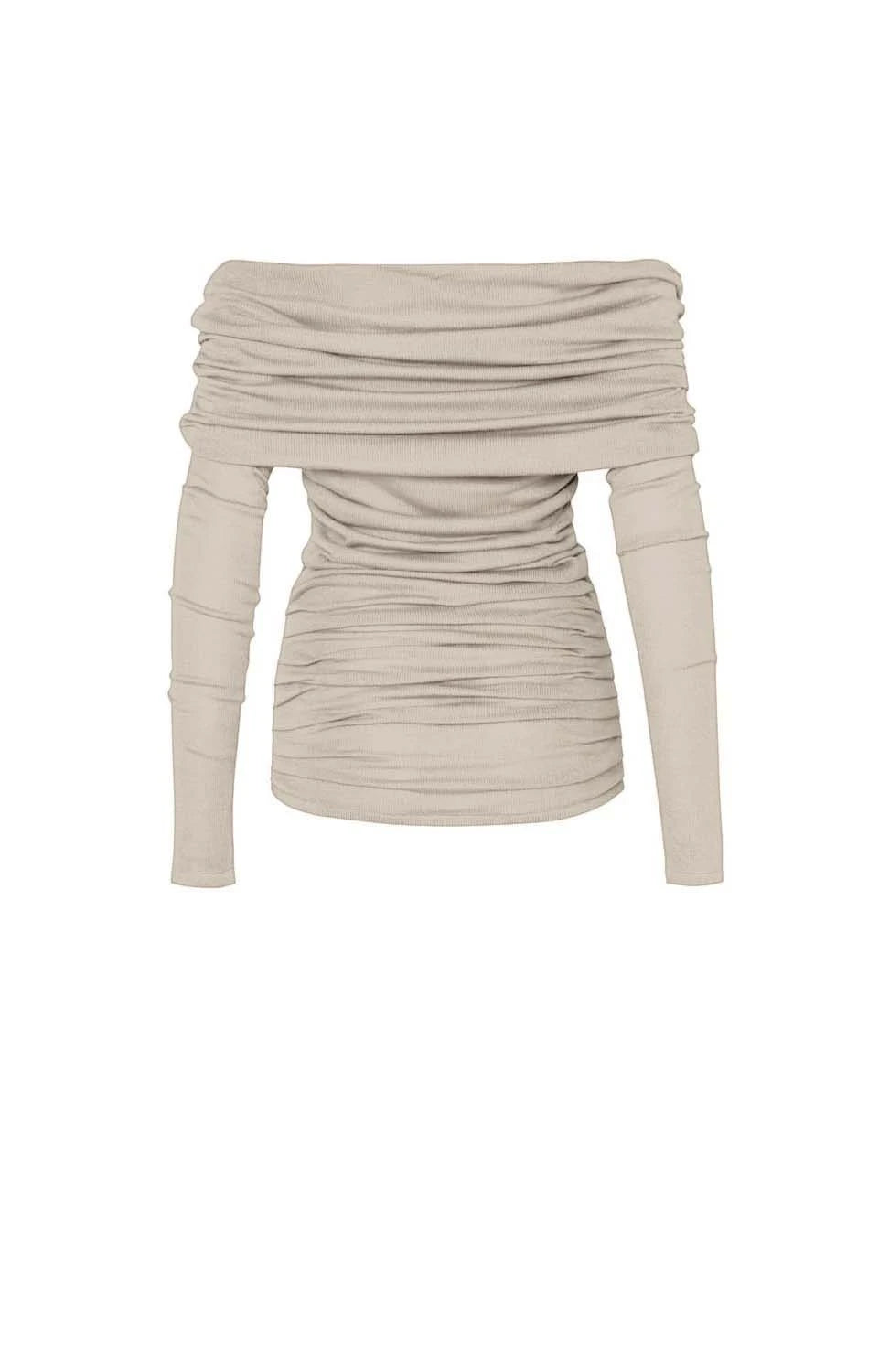 Introducing the "Fuji Top" in Honey – this off the shoulder top exudes effortless elegance with its draped and ruched silhouette. Crafted from a knit fabric, it combines comfort with a touch of sophistication. Perfect for any occasion where you want to showcase both style and ease.