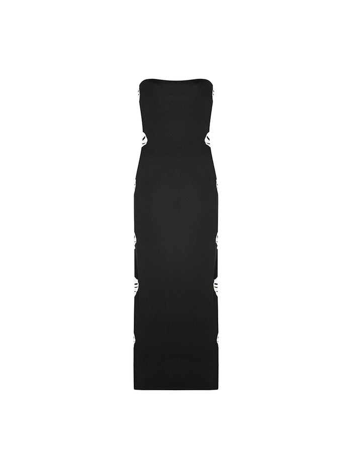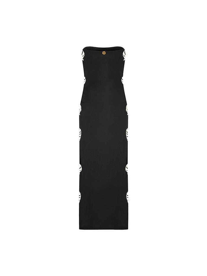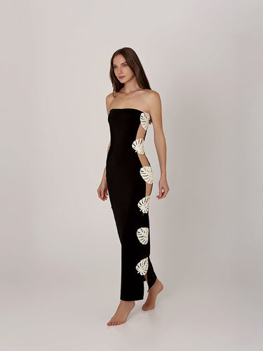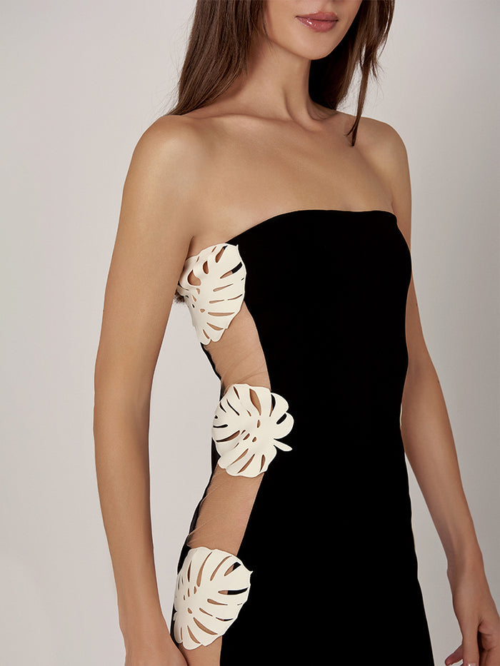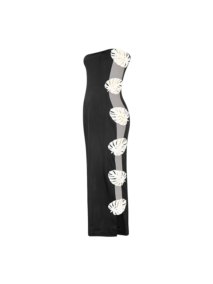 Cette robe longue et droite présente une bande de feuilles dans un doux ton ivoire qui descend du haut vers le bas, évoquant la grâce et une touche d'élégance.