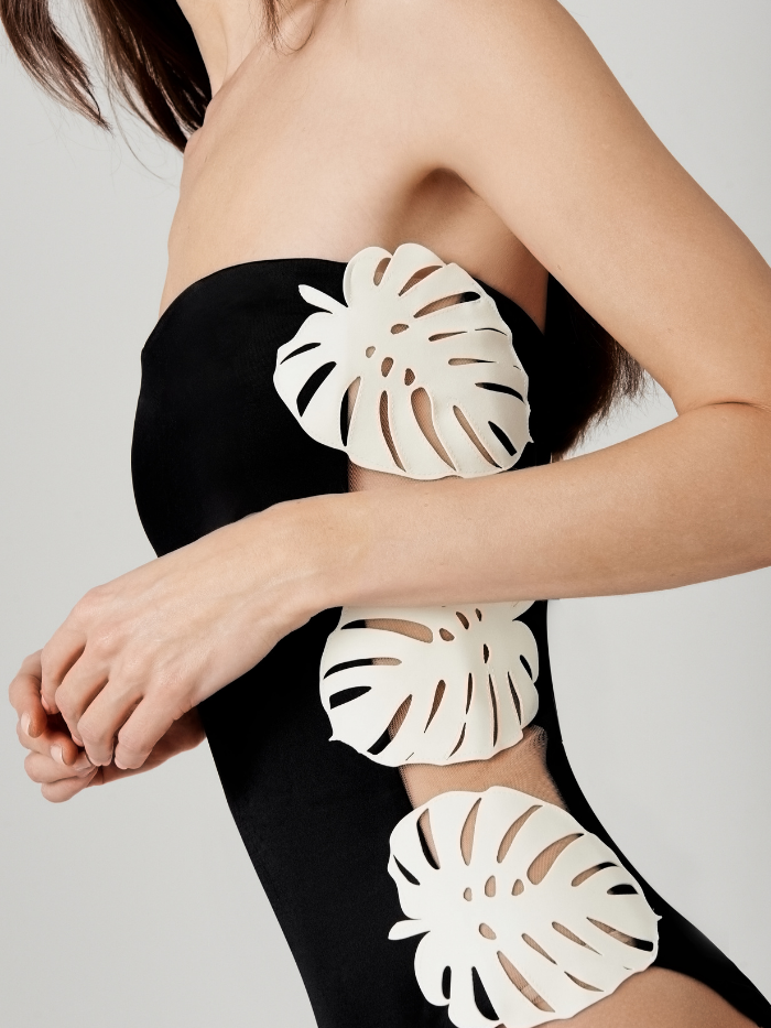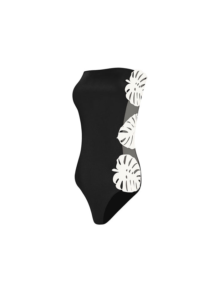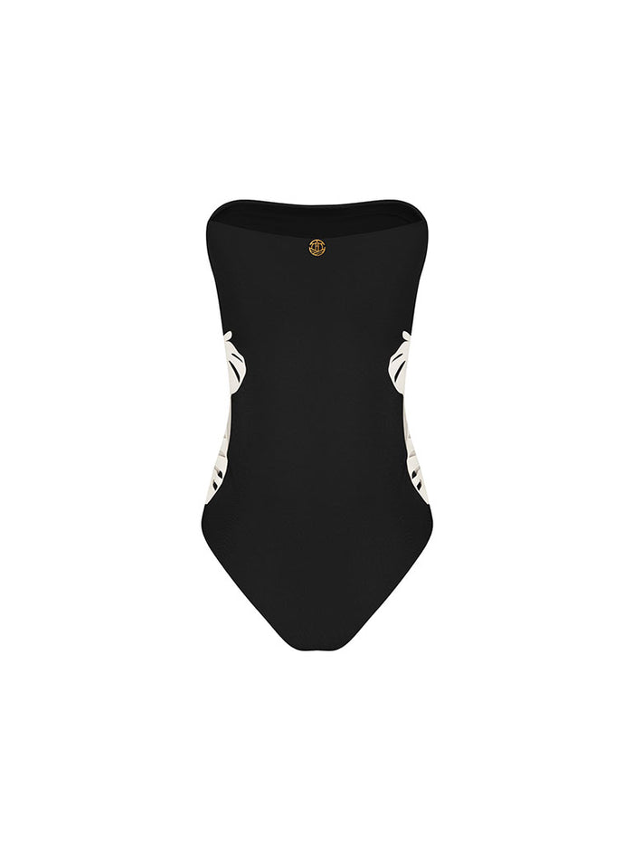 Ce maillot de bain une pièce allie subtilité et élégance. Orné d'une bande de feuilles ivoire sur les côtés, il apportera une touche distinctive à votre look de plage. Associez-le à notre jupe brodée Dalia pour un look complet.