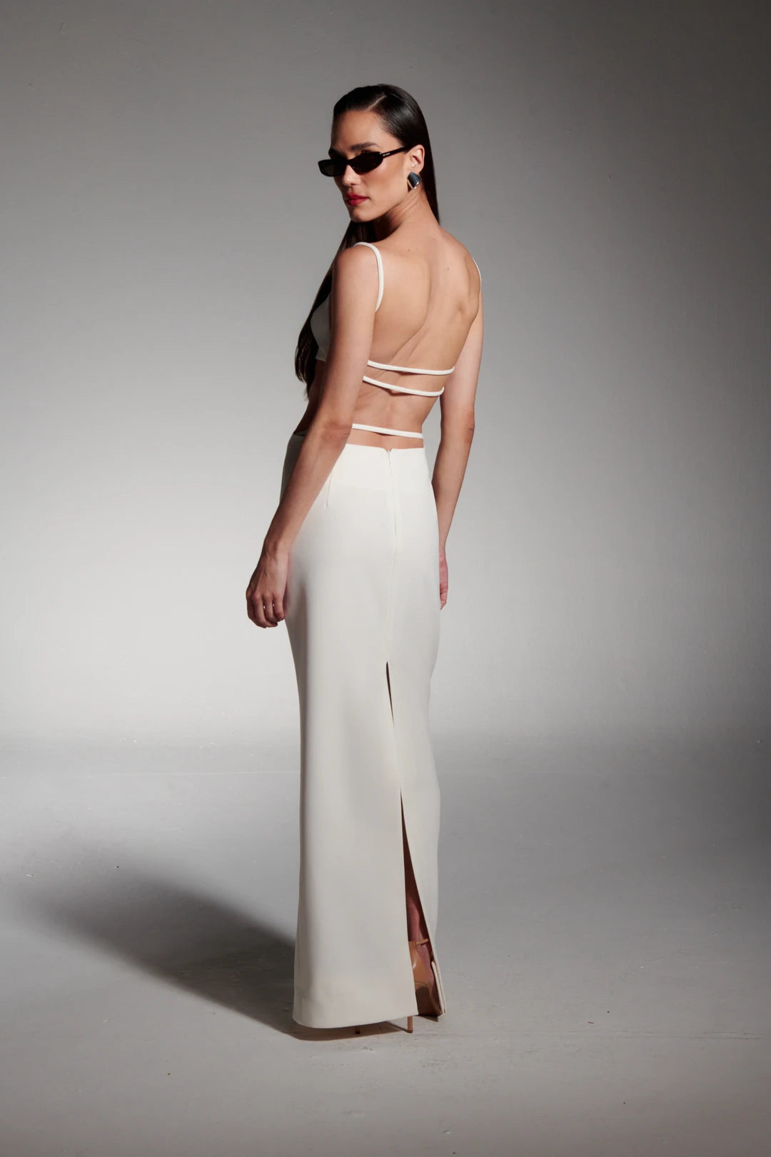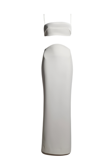 Ensemble tailleur légèrement satiné. Haut minimaliste à visière superposée et tissu légèrement satiné, doté de bretelles de maintien dans le dos et boutonné sur les côtés. Jupe droite fendue dans le dos, au design organique et à la taille arrondie. Fermeture au dos par zip invisible de 20 cm.