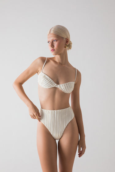 The Areia bra has a balconette design, adjustable straps and a gold-plated clasp on the back. Its fully ribbed front reproduces the sand of the dunes. This piece has UV 50+ sun protection.
