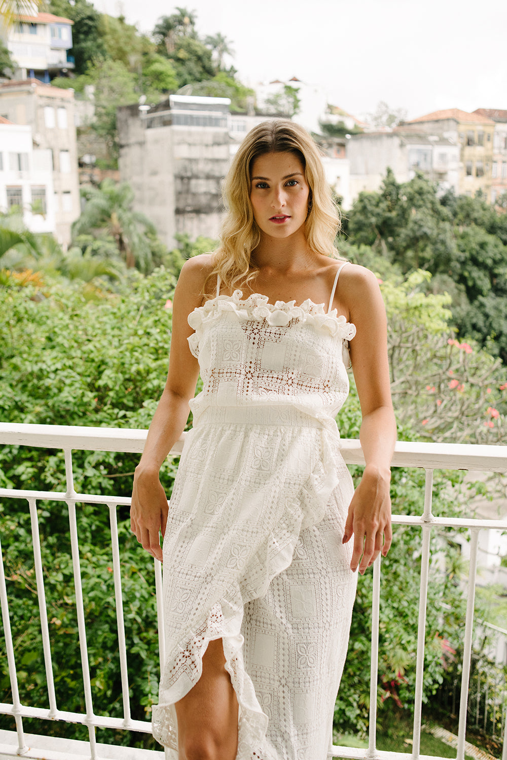 Blouse in imported Italian lace with viscose top, has a straight fit, side closure with a detachable zipper and details on the ruffles structured by nylon thread.